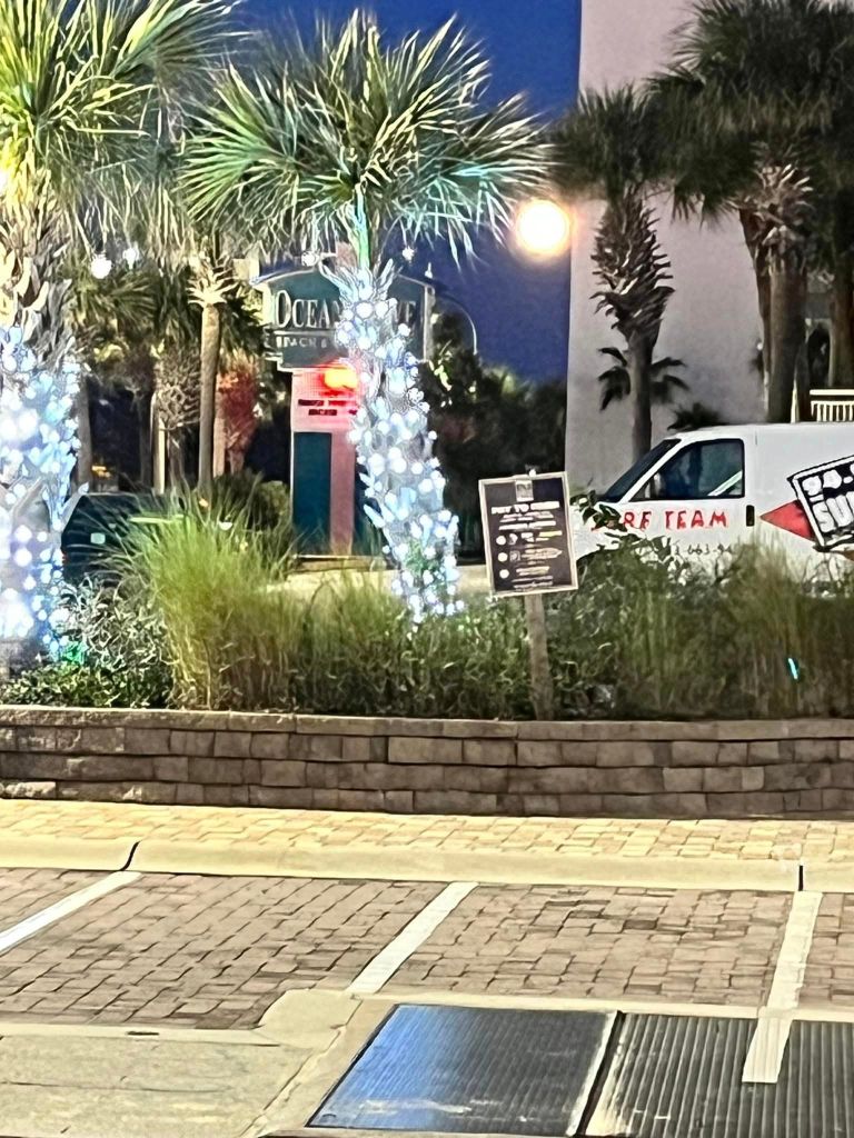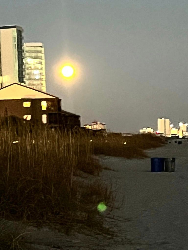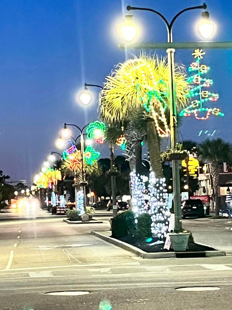 Once again we came back to where we lived for nine months – North Myrtle Beach and all the decorations for Christmas – along with a full moon and beautiful sunset.