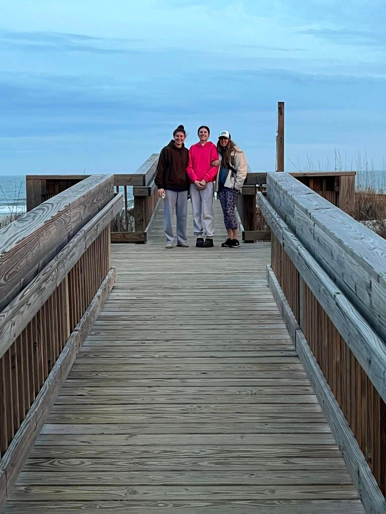 Ella – Sarah and their mother Debby – standing at the end of the long walkway to the beach.