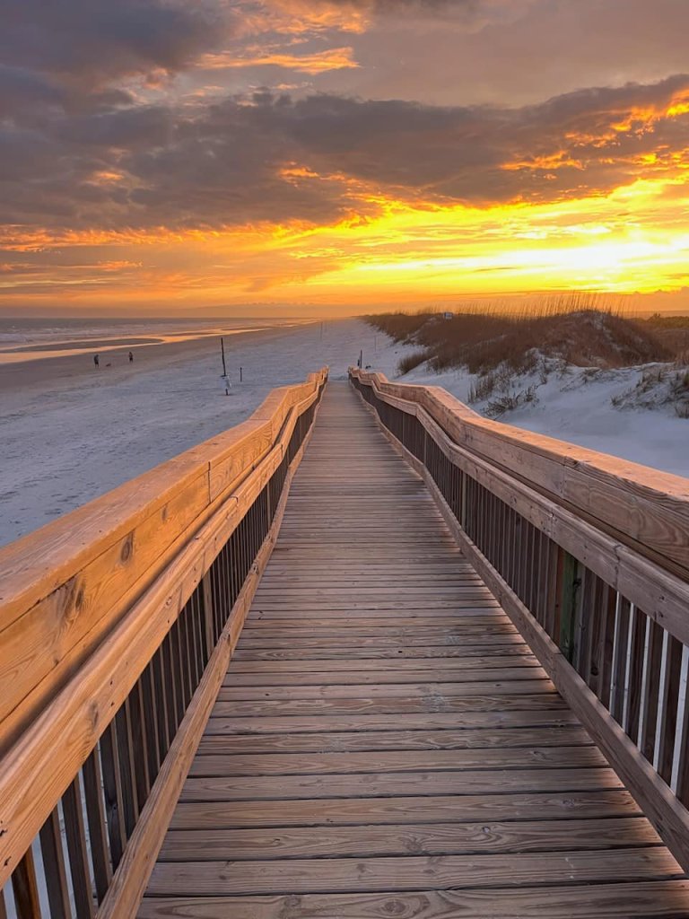 The sun sets over the marsh and they continue along the walkway to the beach entrance!