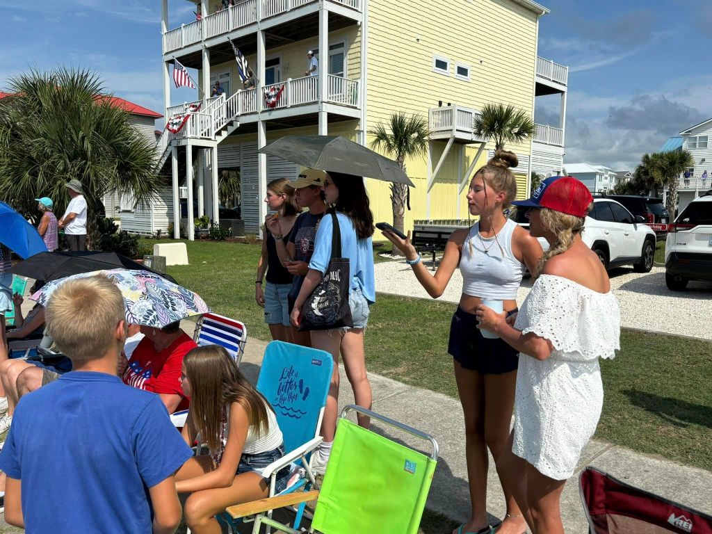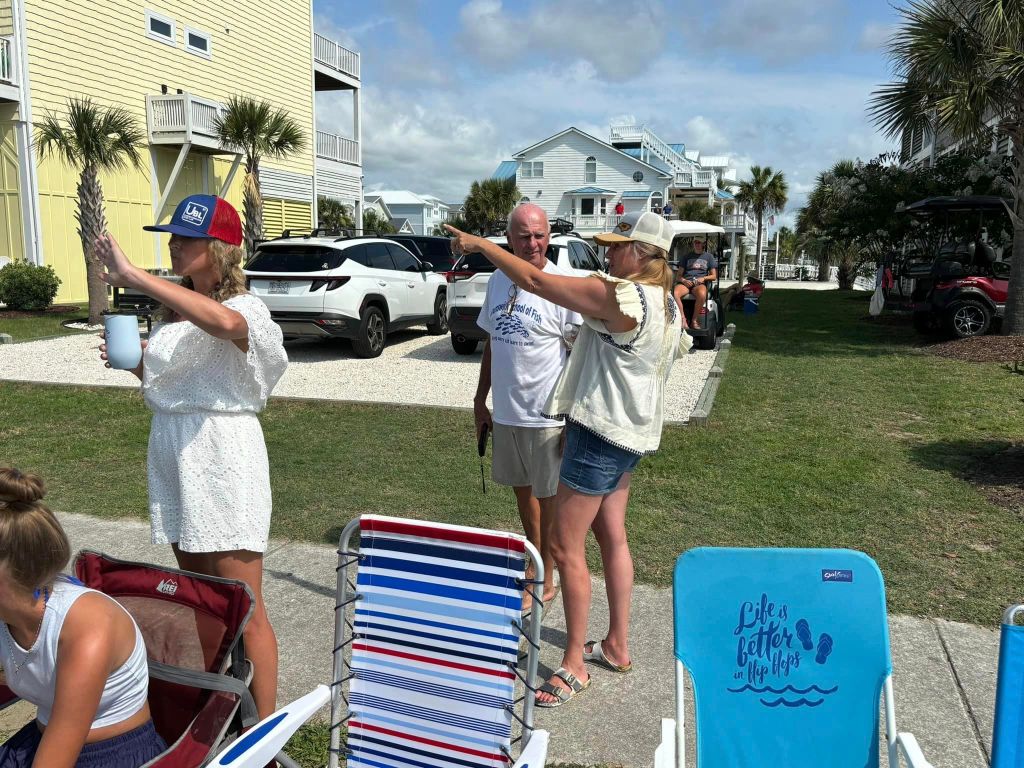 Bode – Sherry – Taylor and Tammy stand by the chairs on the curb front –
