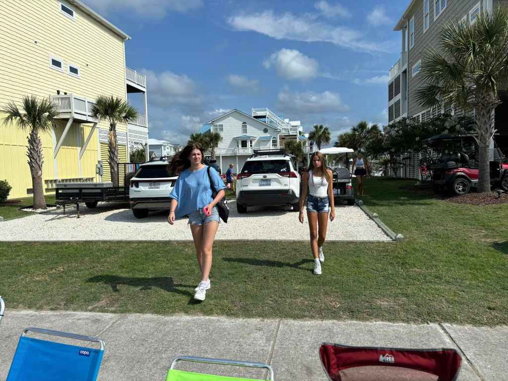 Sarah and Cassidy walk from the lot where we parked to the curb with the chairs!