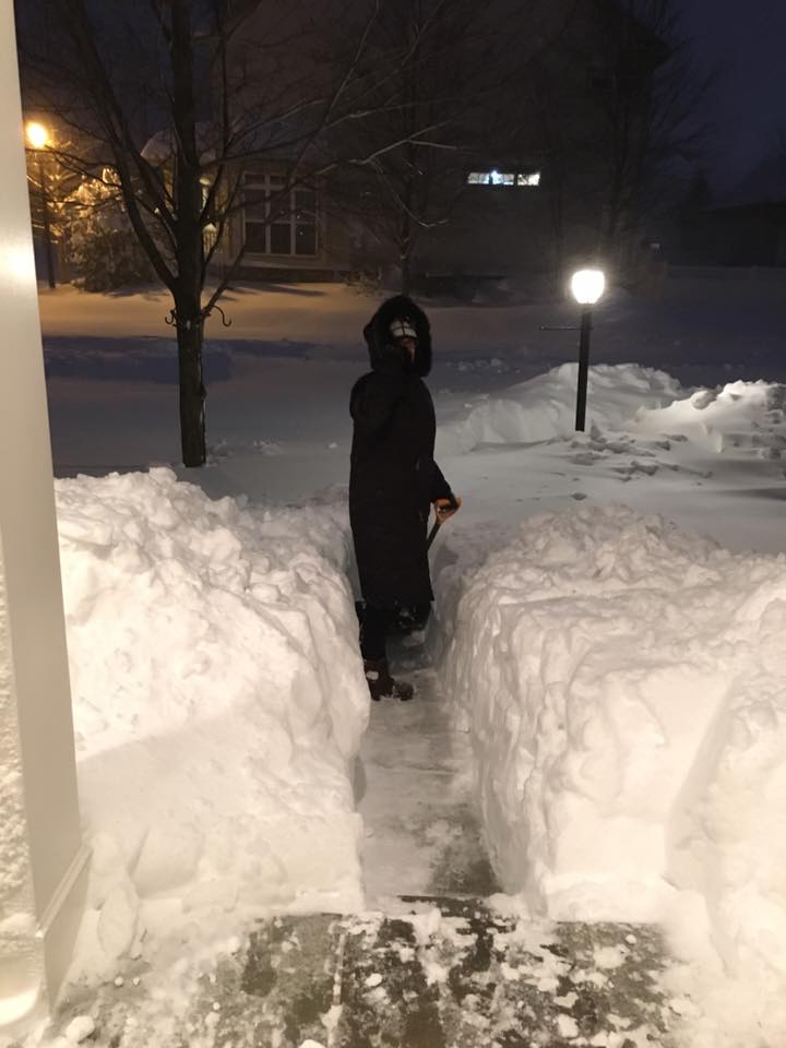 Here Sherry attempts to clear a path on the front sidewalk!