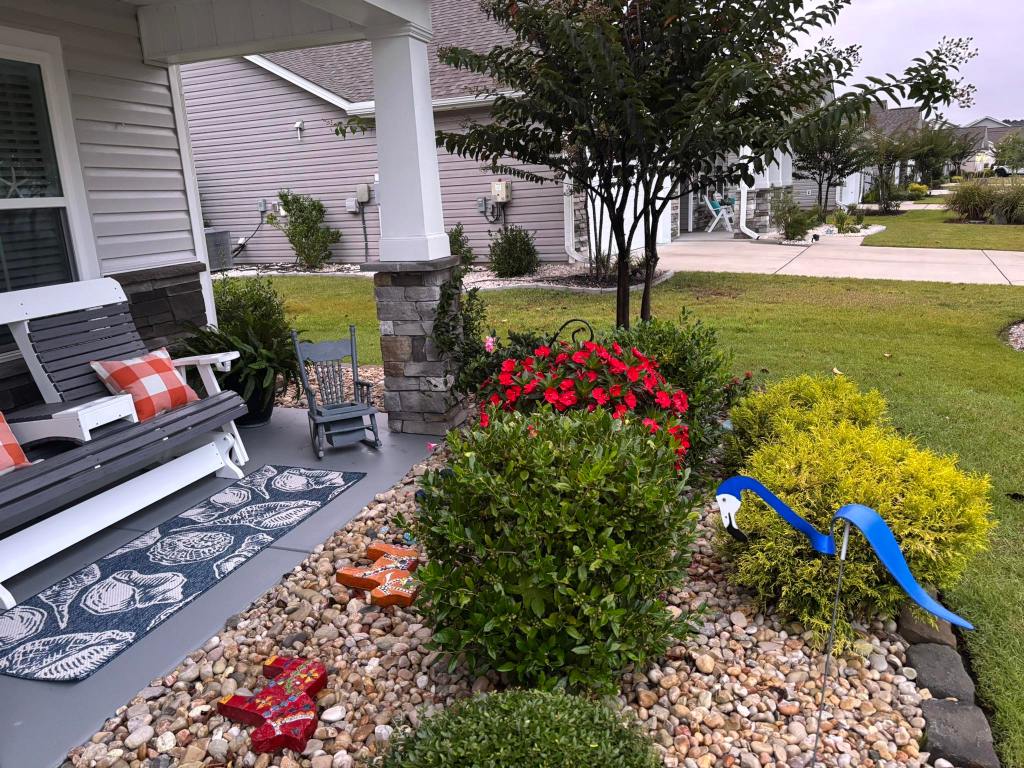 My quiet place ( Front porch) where I sit and watch the neighbors walk, bike, or drive by!