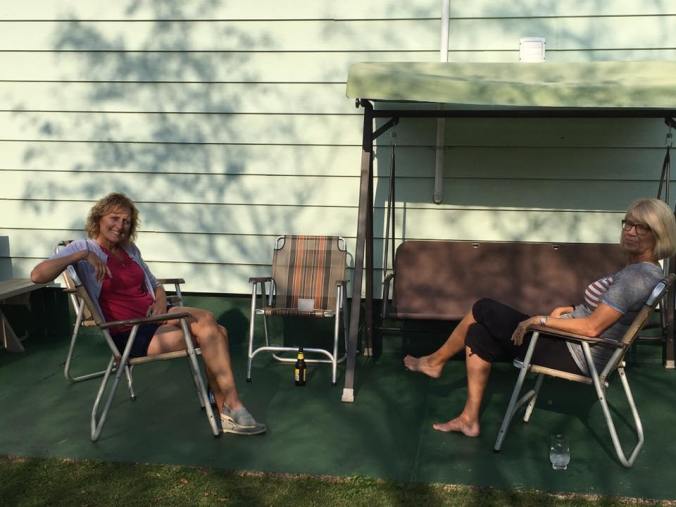 Cindy and Sherry are sitting on the patio at her mother’s house during the SWEDISH FESTIVAL!