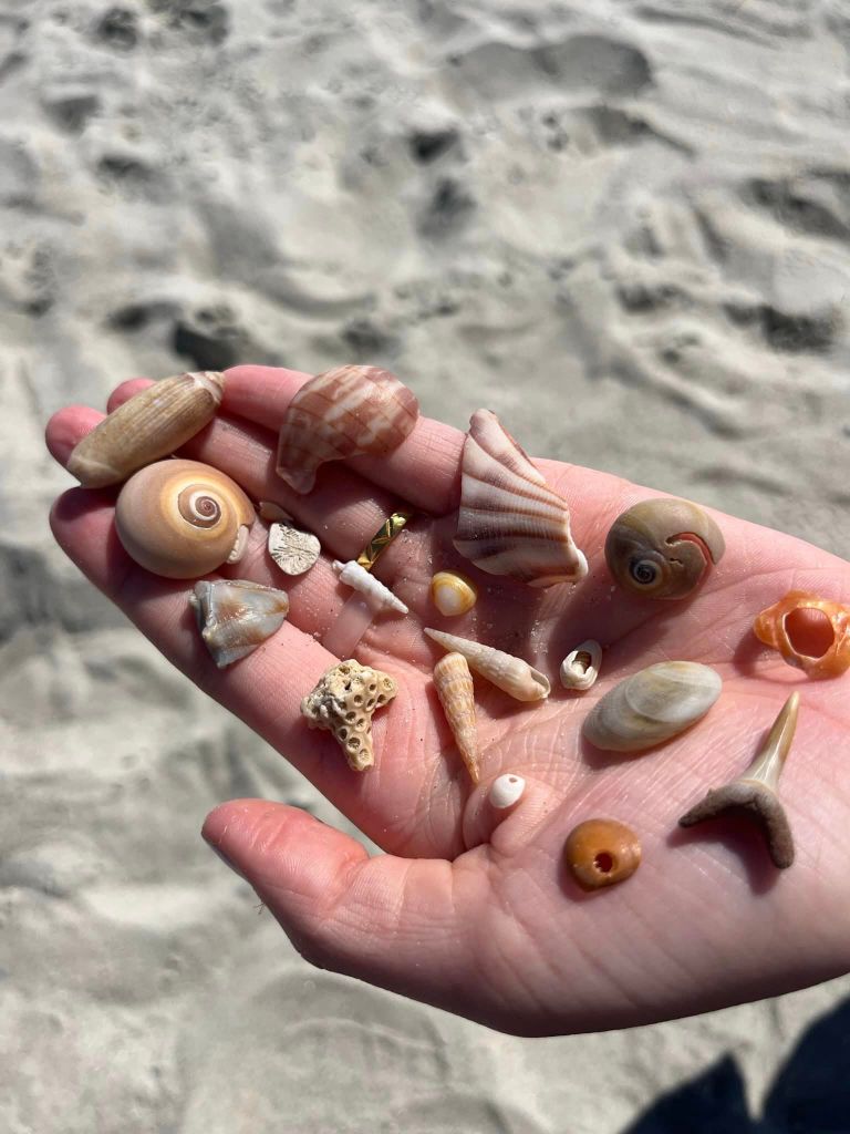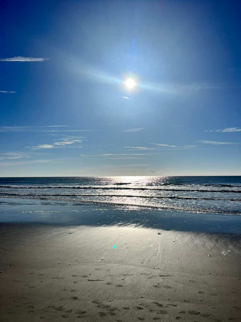 This morning’s walk was beside a calmer ocean – lots of sea shells and tracks of birds and footprints of previous walkers.