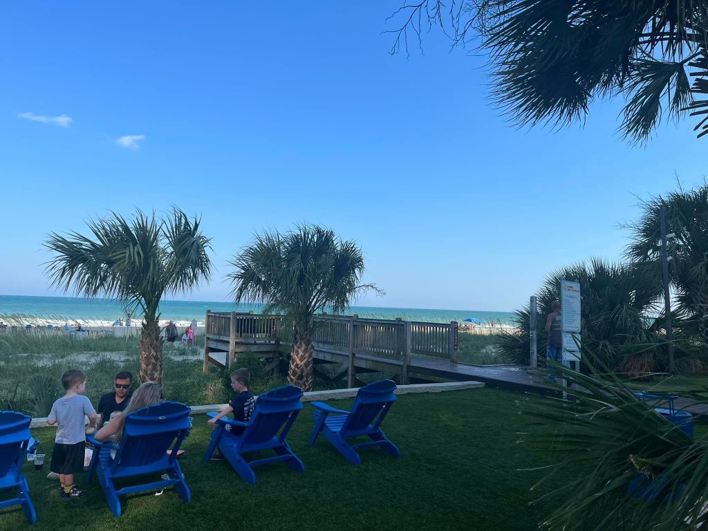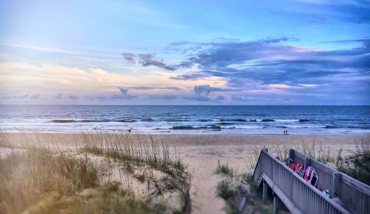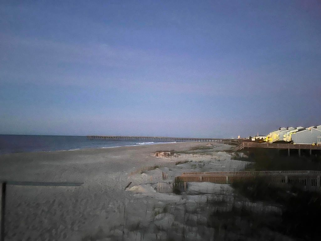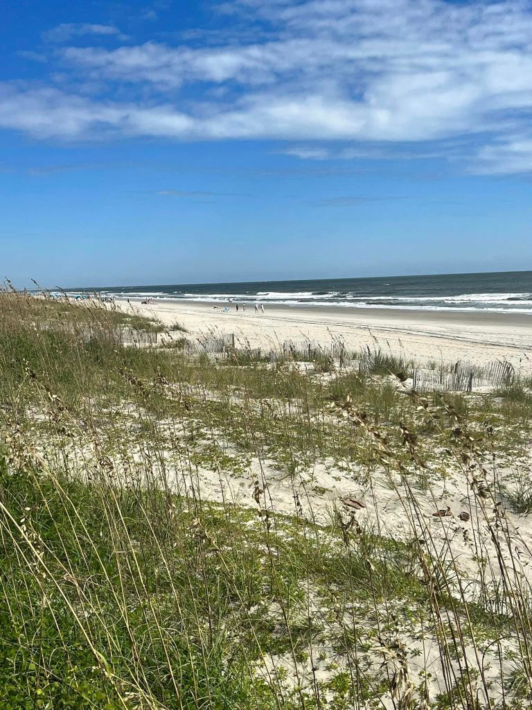 Across the street in the beach entrance – dunes and sand – Carolina blue skies and white clouds.