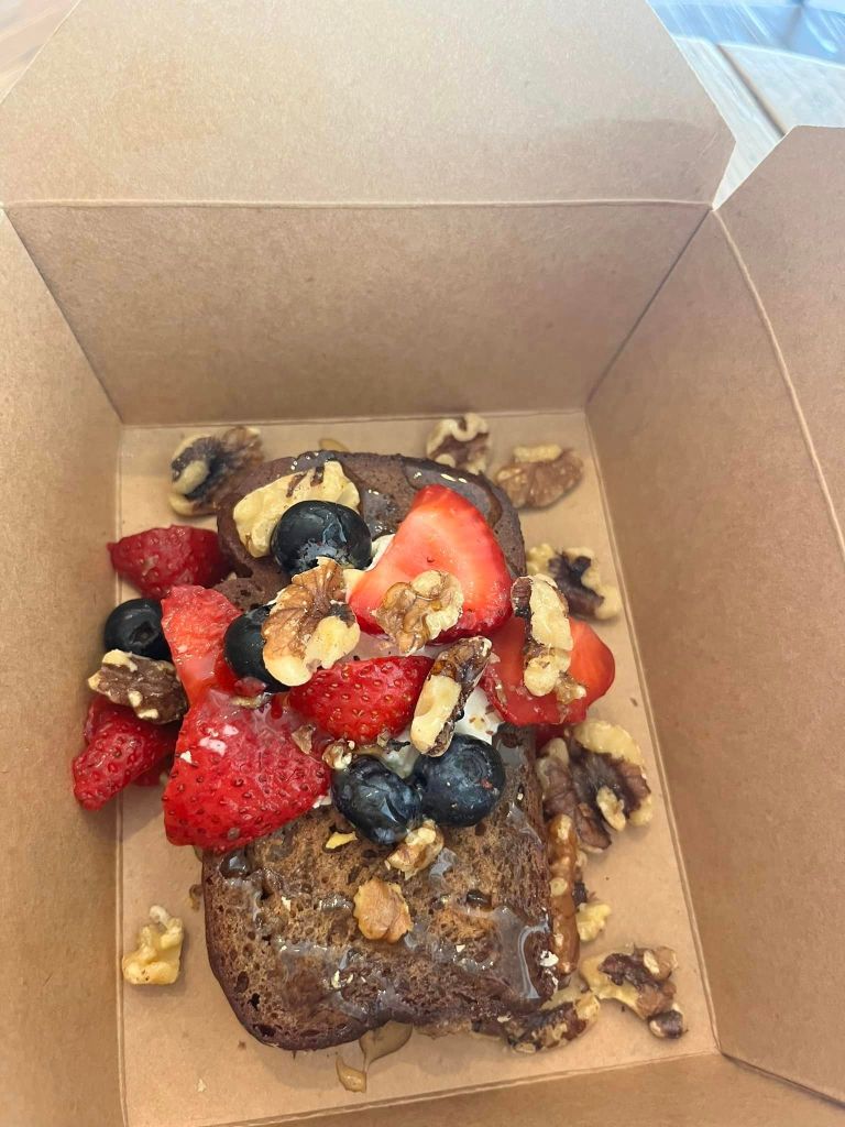 and a Banana Bread with some sort of cream cheese – strawberries – walnuts – blueberries and drizzled with honey to share!