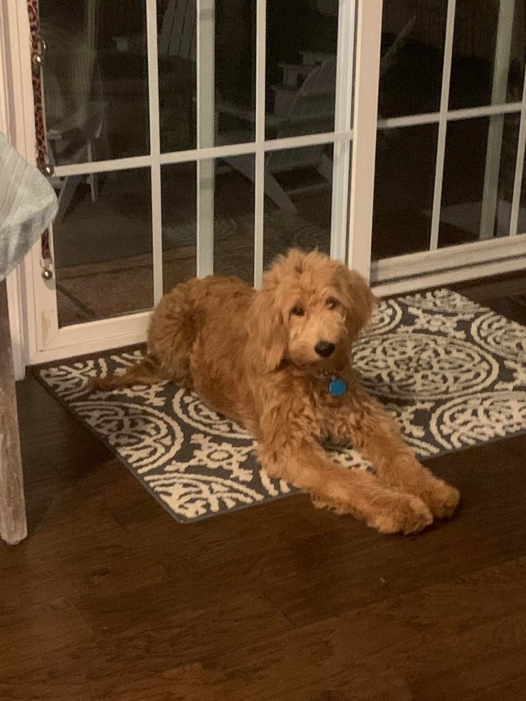 She is adorable and is a Goldendoodle – judging by her feet – she will be very large! She is so friendly and loving.