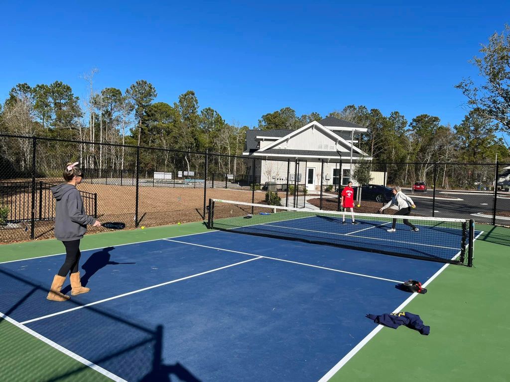 Here Tammy is on one side and Sherry and Cassidy on the other. The courts are brand new and hoping soon the center will be finished and we can use it and the pool when it gets warm.