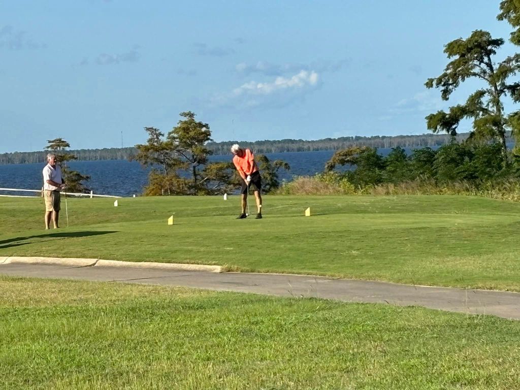 Buck getting ready to tee off – it was a beautiful day – sunshine – gentle breeze – ideal for golf.