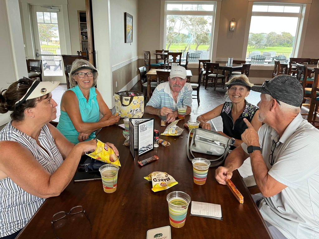 We get together every so often to play a scramble – Gals vs. Guys