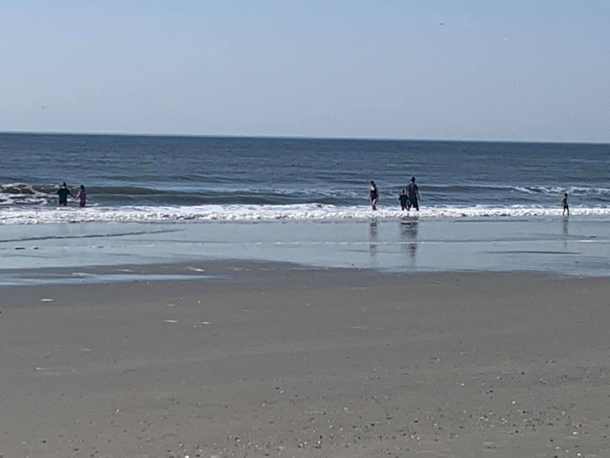Now – in the afternoon we decided to do a couple hours of a beach day – taking and carrying our chairs to the beach. Here is the same view looking toward North Myrtle Beach – a lot more people and a lot of people in the water. But we still had our own space – no one within thirty feet of us!