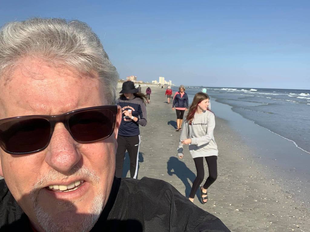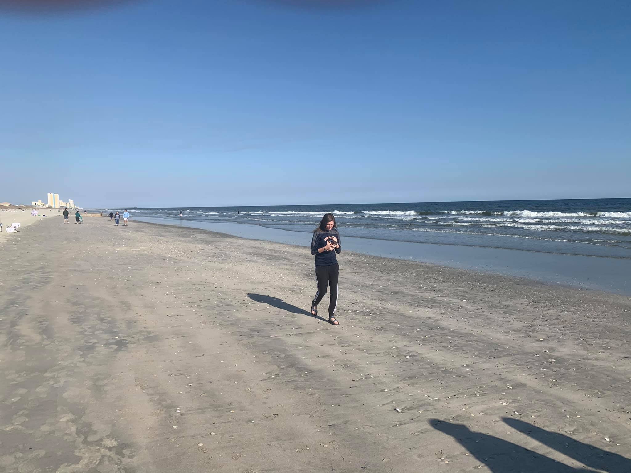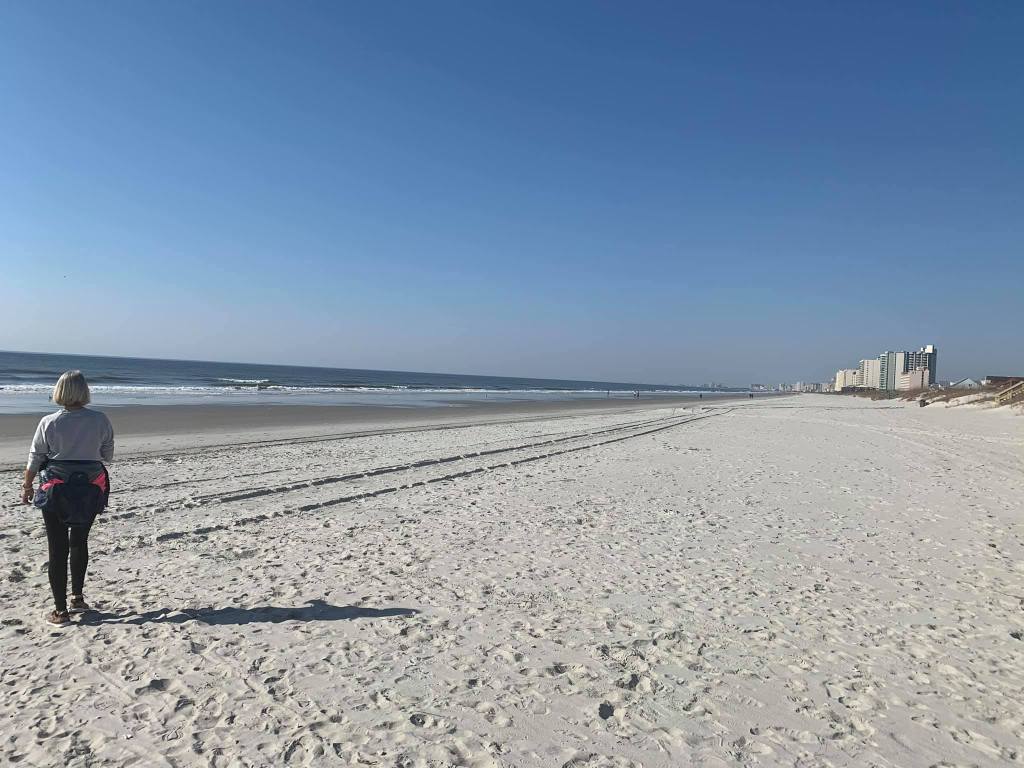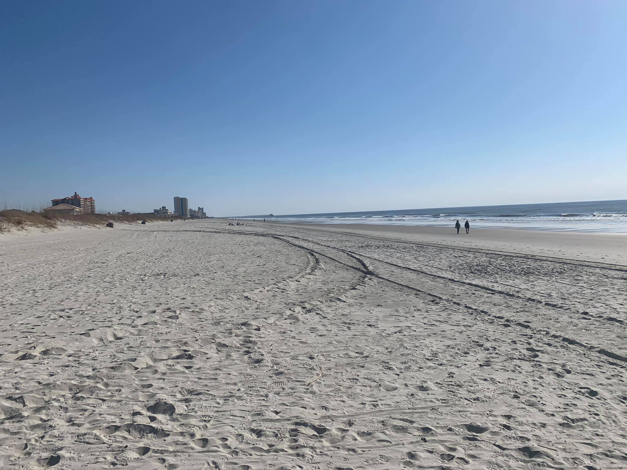 Here is the same view in the afternoon looking toward Cherry Grove! And – it will get more crowed as Spring turns into Summer with vacations! We are in the open space and avoid large gatherings which happen mostly toward North Myrtle Beach town center. A lot of young H.S. and college students gather on the beach there in a large group. You just avoid them as they will do what they do regardless!