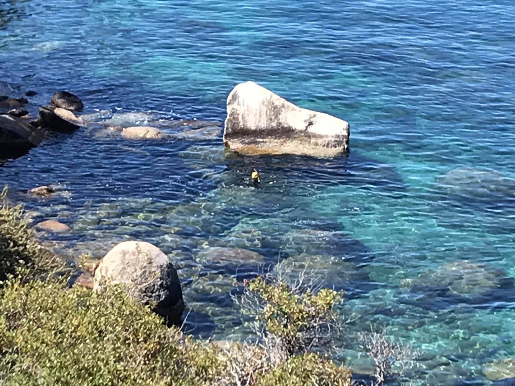 Mt. Rose – 8250 feet highOur first sight of Lake TahoeCindy and Sherry pointing at the lake although it looks like trees they are holding up ! Lake TahoeClear watersSwimmersSwimmers snorkeling