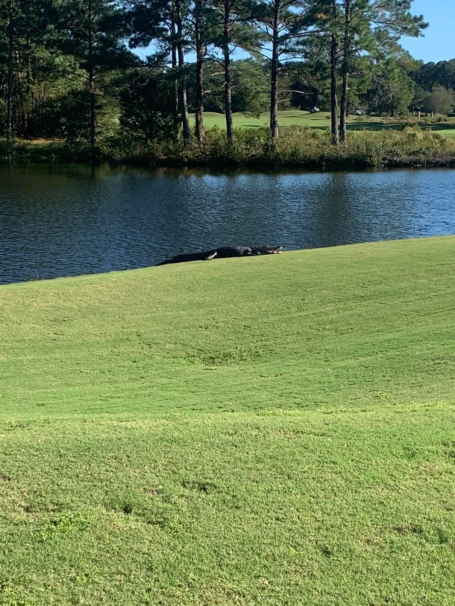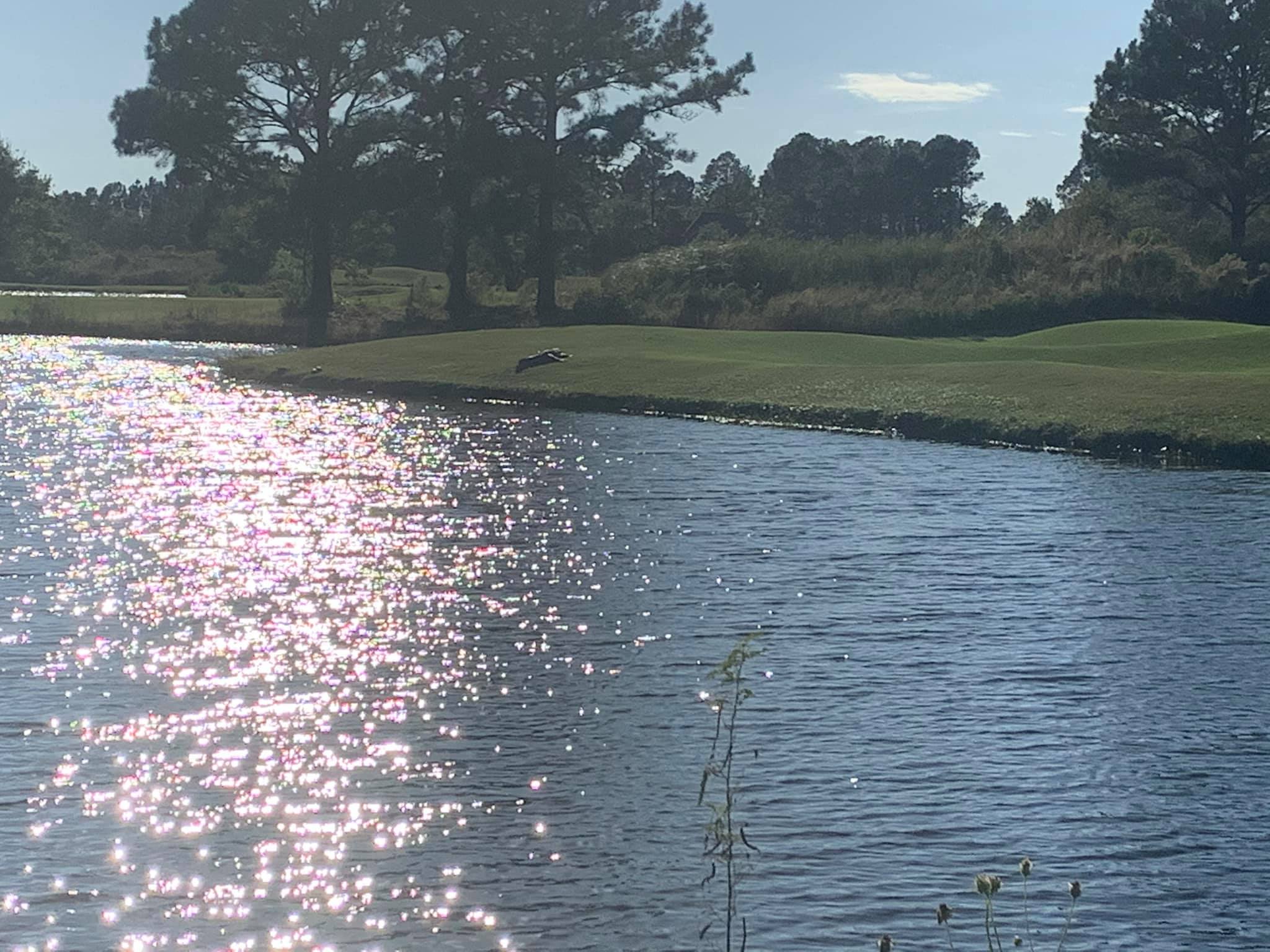 A look at one of the many many water hazards!Gator laying on the bank sunning itselfSherry hitting from the fairwayCindy hitting from fairway – they both are never in trouble always down the middleClimbing the bank to the elevated green Getting ready to tee offAnd the dawn breaking of the day we went golfing from our Lanai