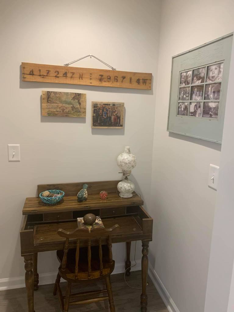 Hallway entrance to master bedroom – great grandmothers desk ( Sherry) numerical location of our prior home – lamp that was a shower present ofr her mothers wedding – a door stopper that belonged to my parents and grandmother – family picture and Mount Nebo church done by my son in law Mike. And a large family history picture of the grandkids to the right.