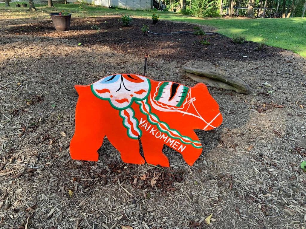 Mike made a Swedish Bear and Ella painted it and did all the artwork on it – Welcome in Swede.