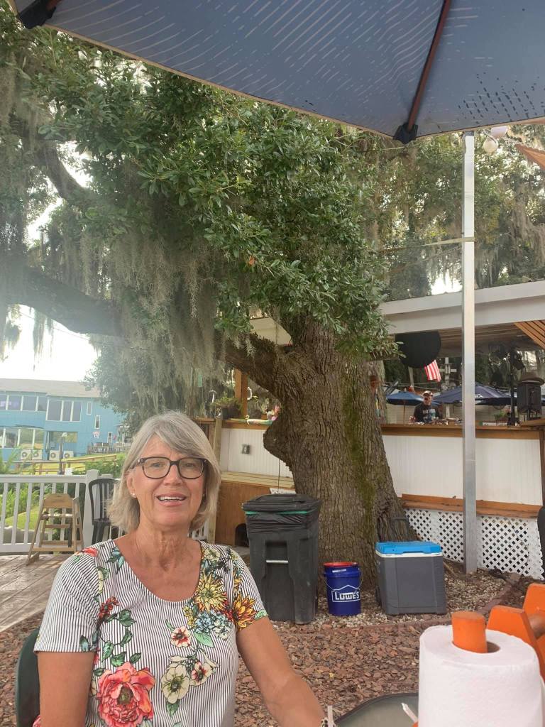 Pam in oversized CAPTAIN ARCHIE CHAIR – fun times and lots of laughs!