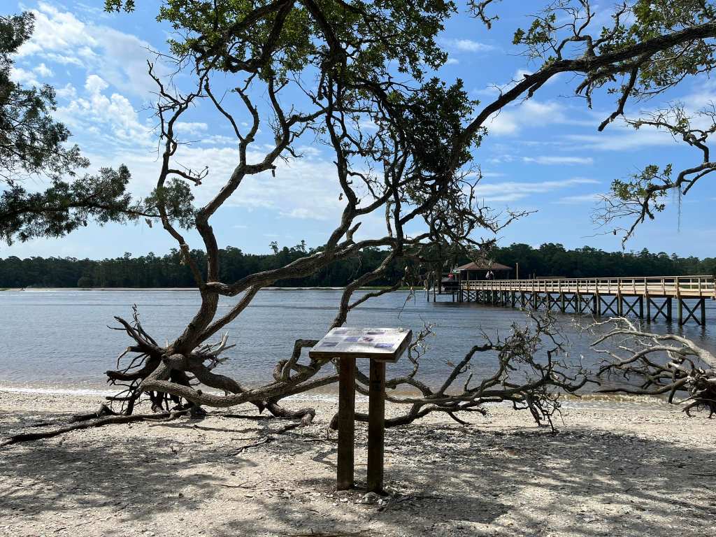 A driftwood tree with a plaque sits high on the dune behind the benches and mailbox.
