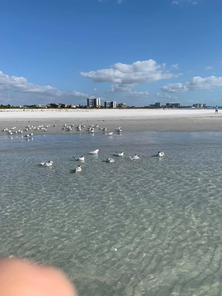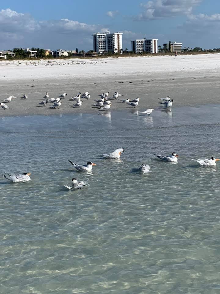 Birds taking a bath they were not concerned about us and they would just duck under the gentle waves and wash themselves so calming!Sherry walking the beach looking for shells which she found big ones!