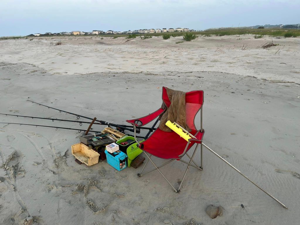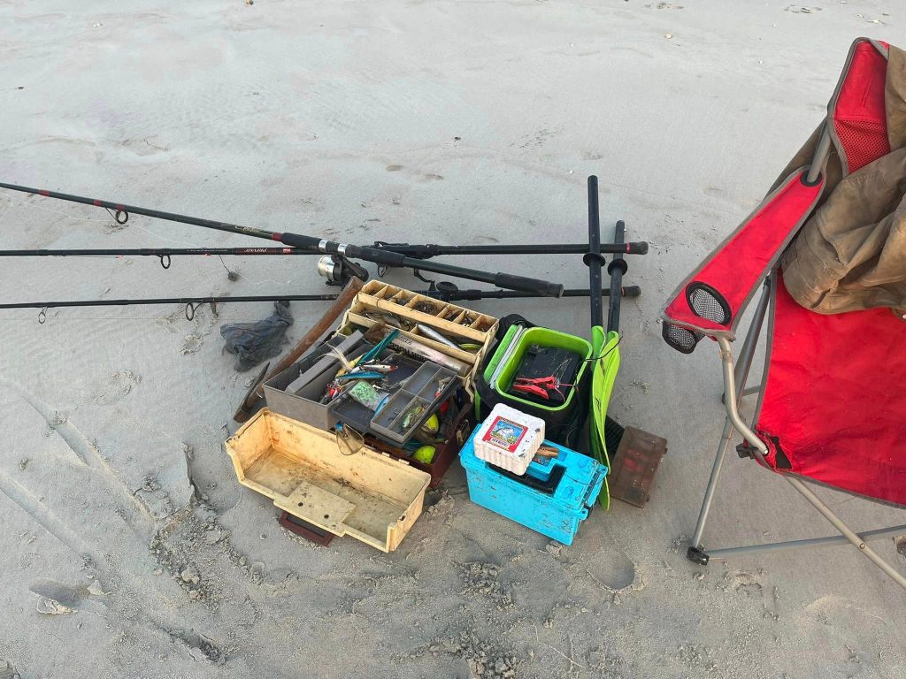 Just before the point, we came upon this sight – a chair with a pair of pants draped over the back – a waterproof shoe in the surf – tackle boxes all open – a battery with jumper cable hooked up –