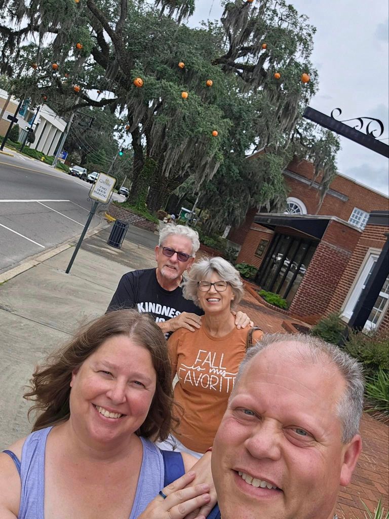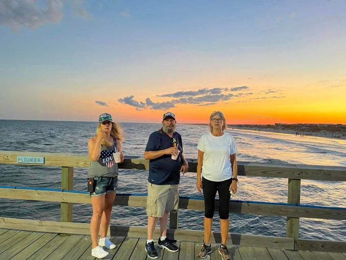 Sitting on the sand for our 75th birthday celebration – July 2024!