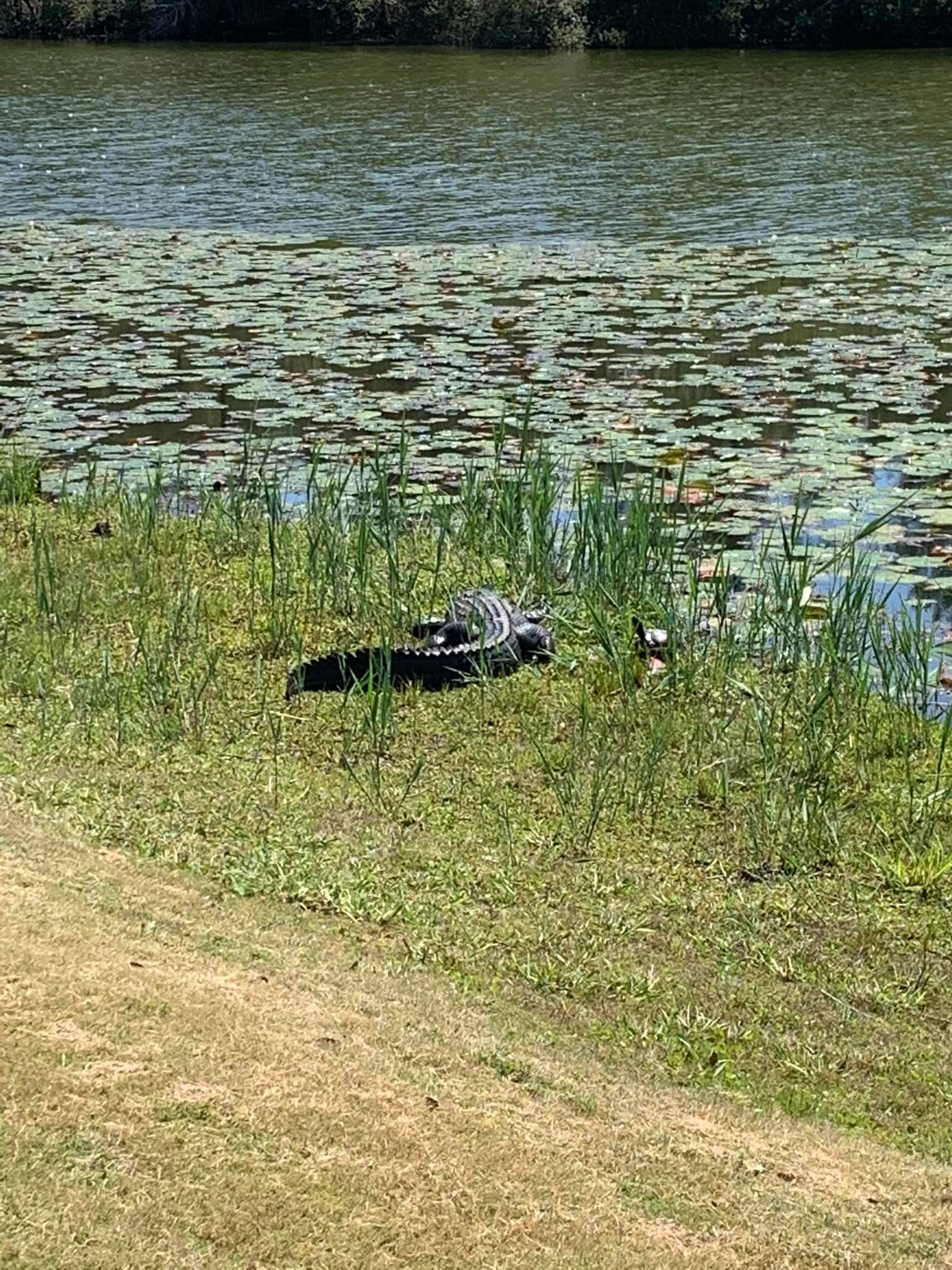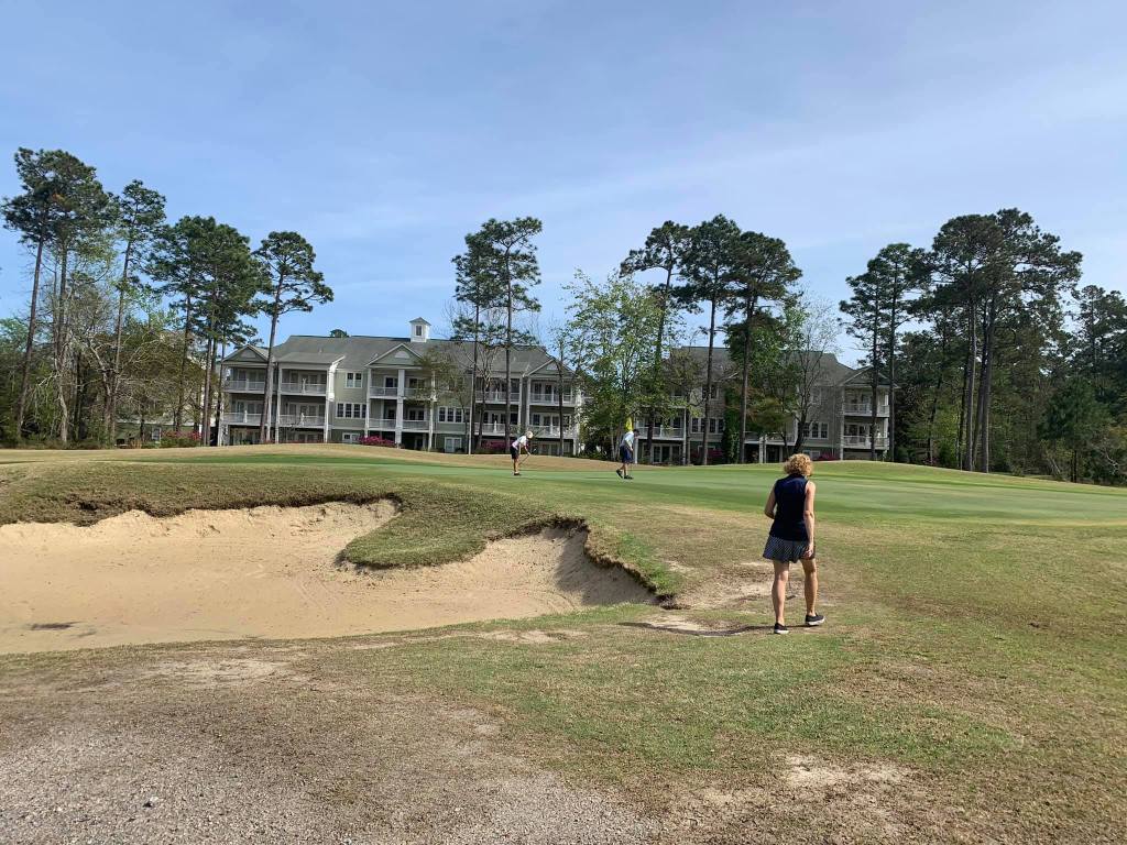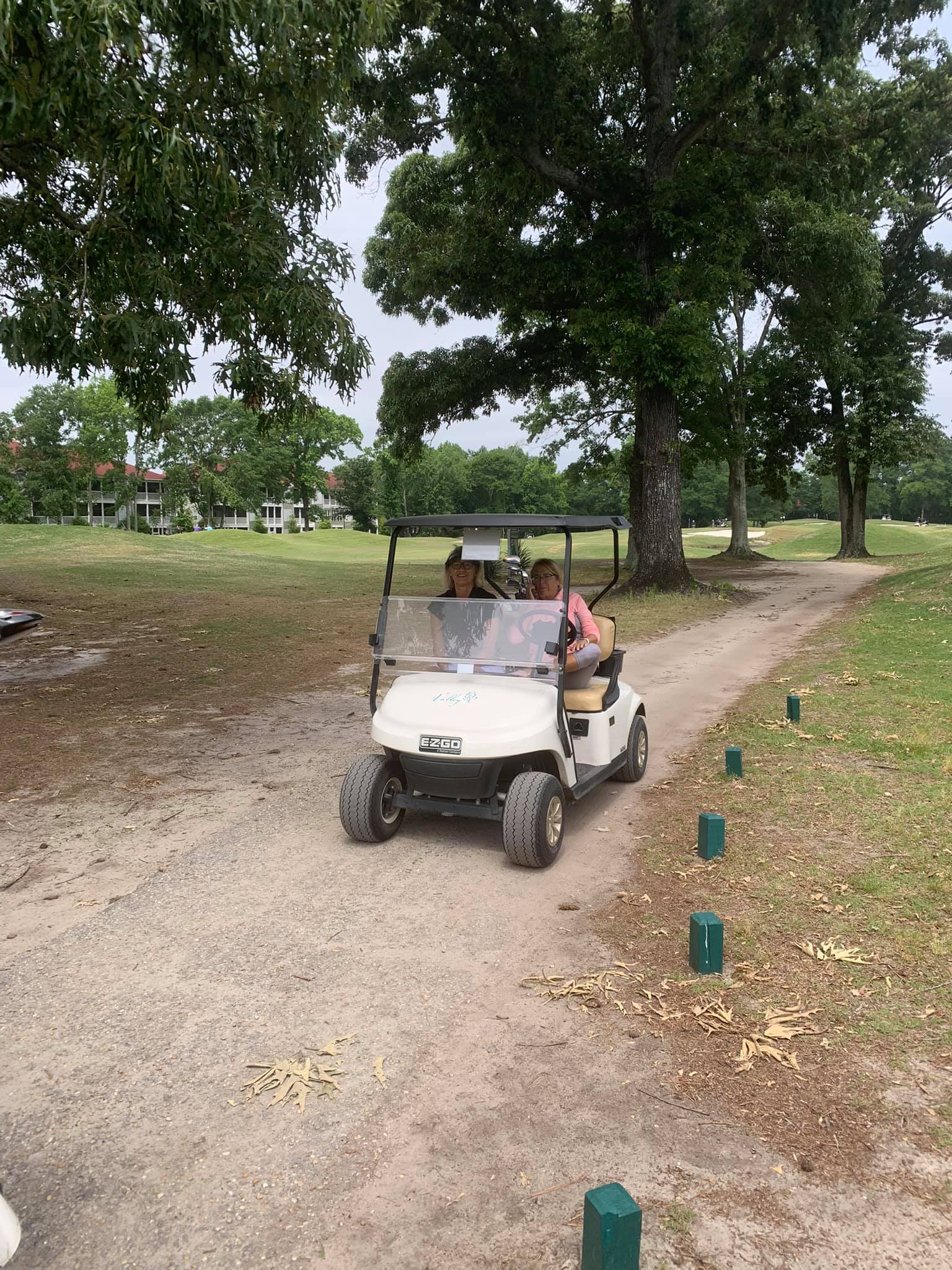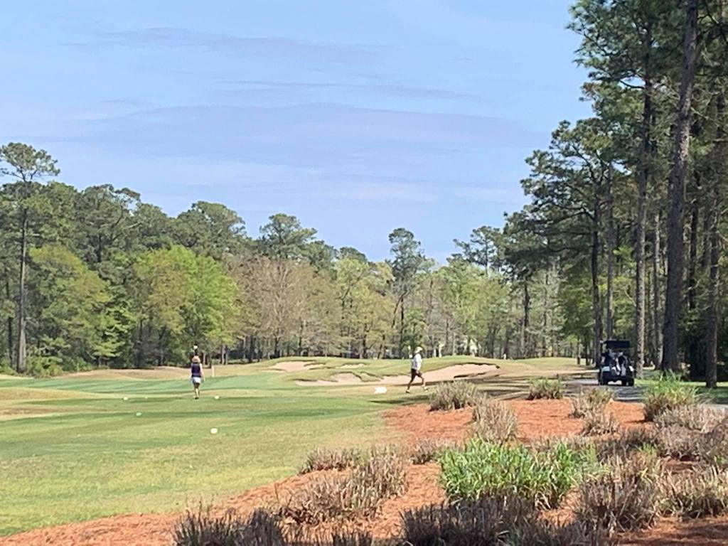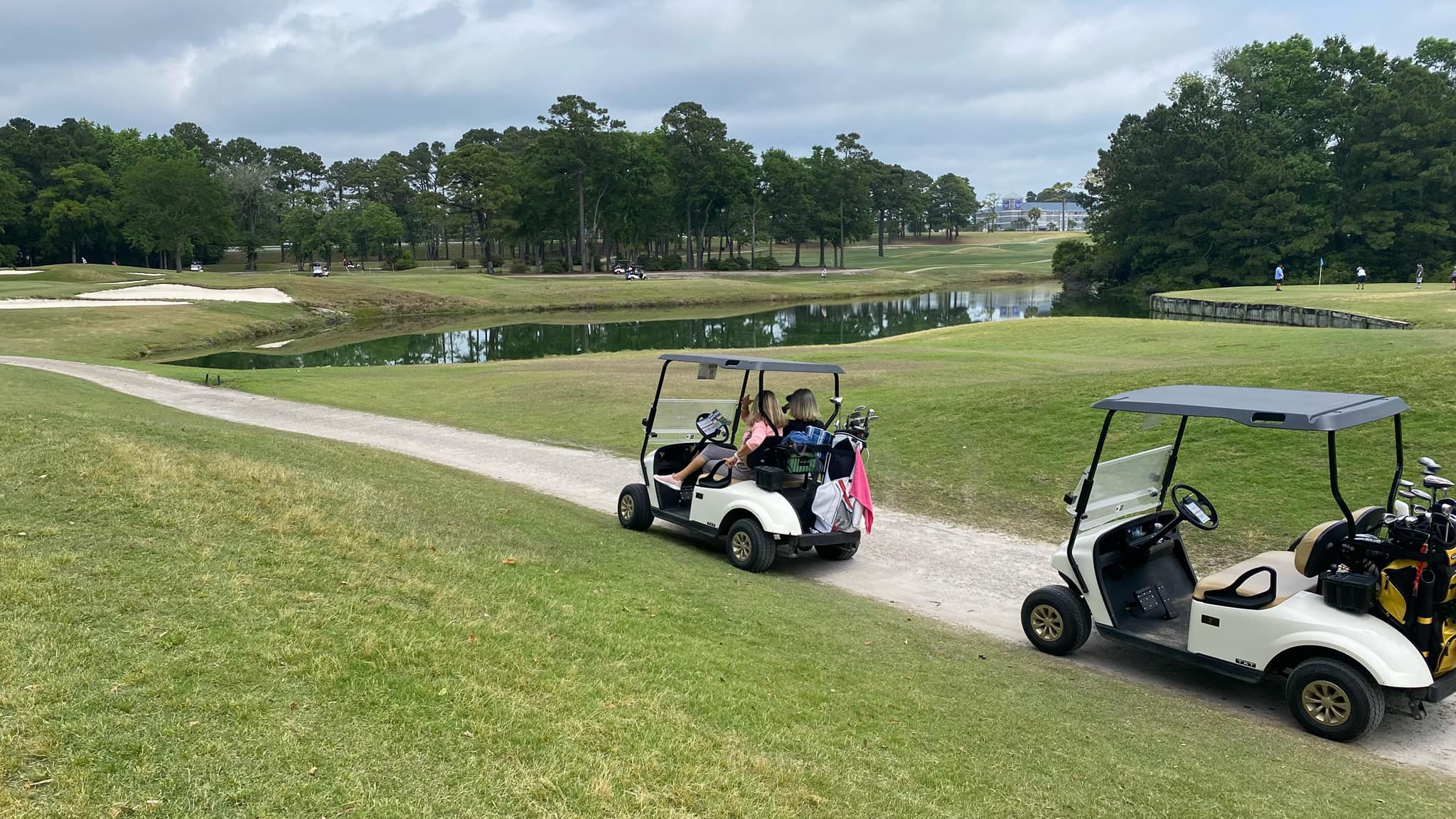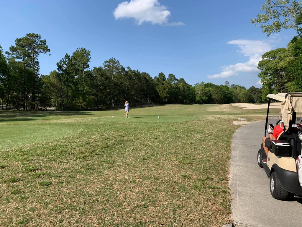 This green – she hit the cart path – this hole for her was 299 yards – after I adjusted her stance and tee height – she ripped one down the right side and it hit the cart path and followed it toward the green – we searched and searched where we thought it had gone – the two guys we were with found it! It was laying just off the green on this side along the cart path. It had gone 299 yards!