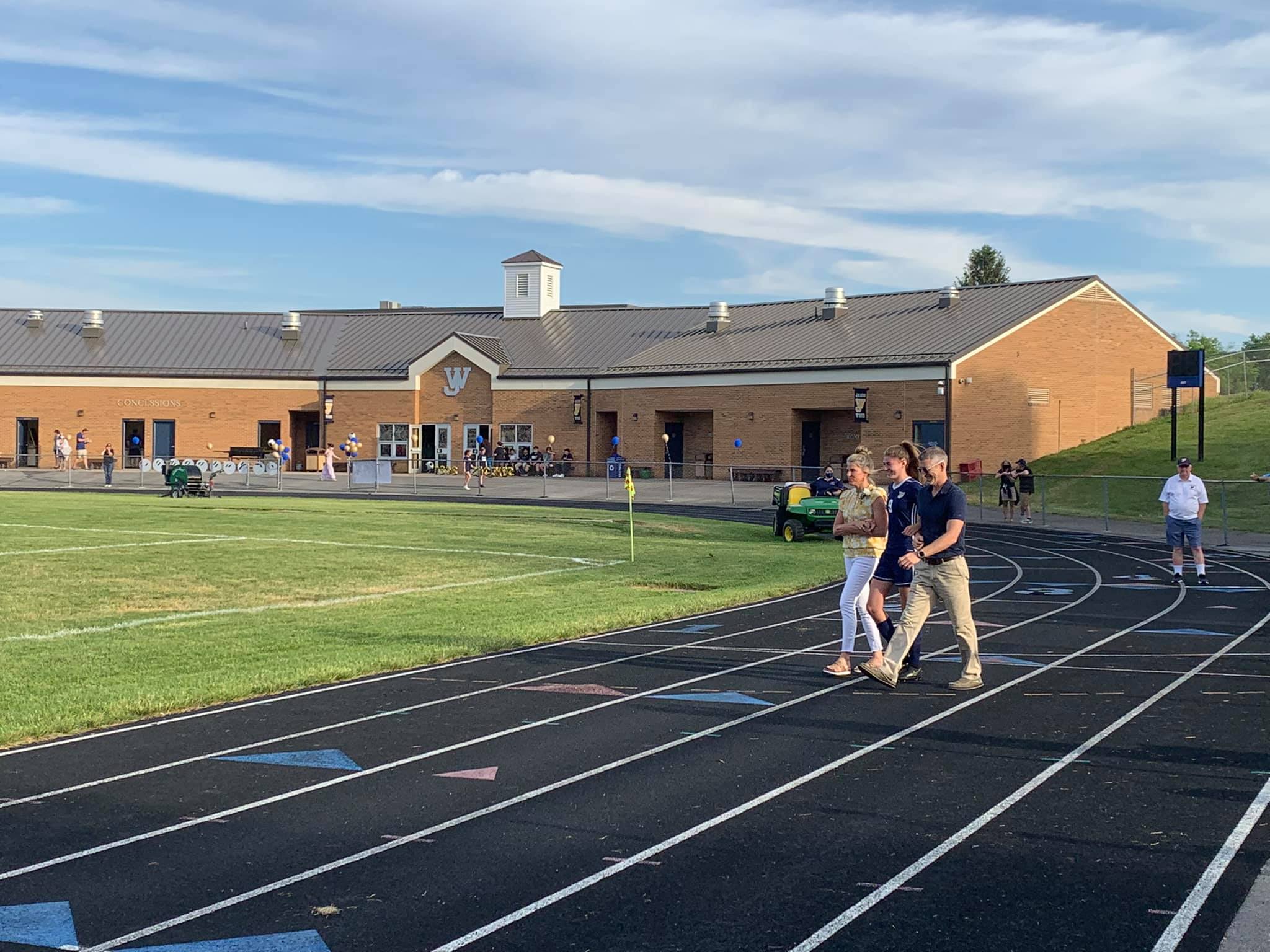 Being escorted by her parents and honored on the field.