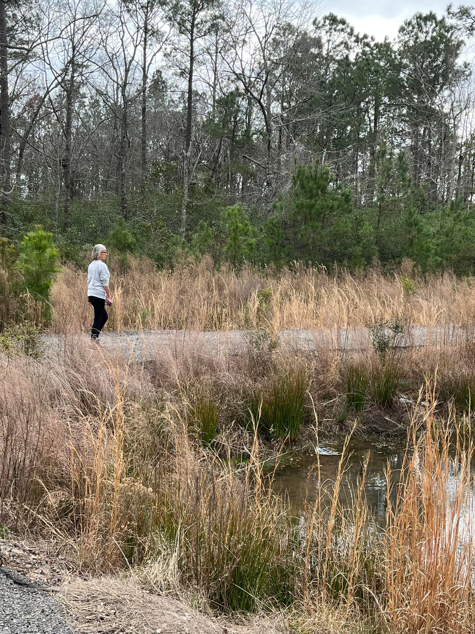 Here you see my wife Sherry starting on the path and the pond is to her right – and in the middle, some 100 feet away is a somewhat raised portion – almost like an old farm road.