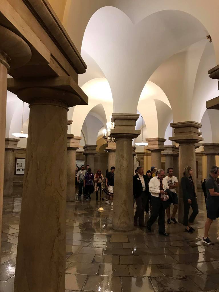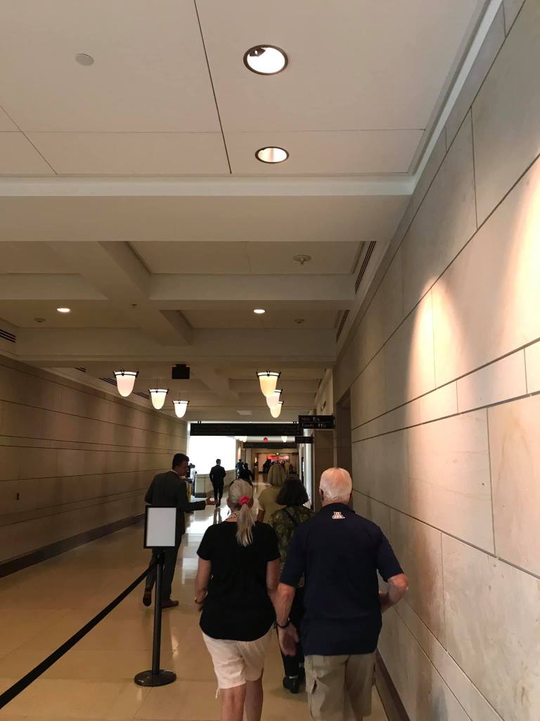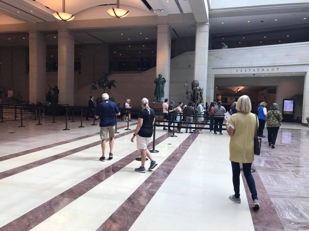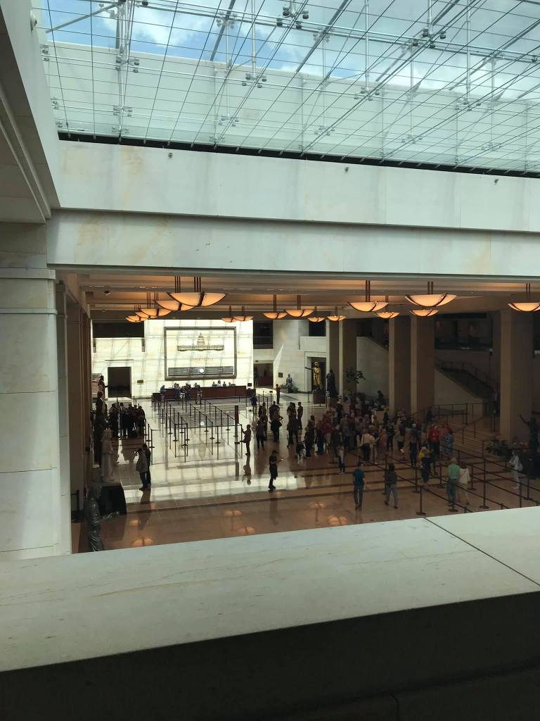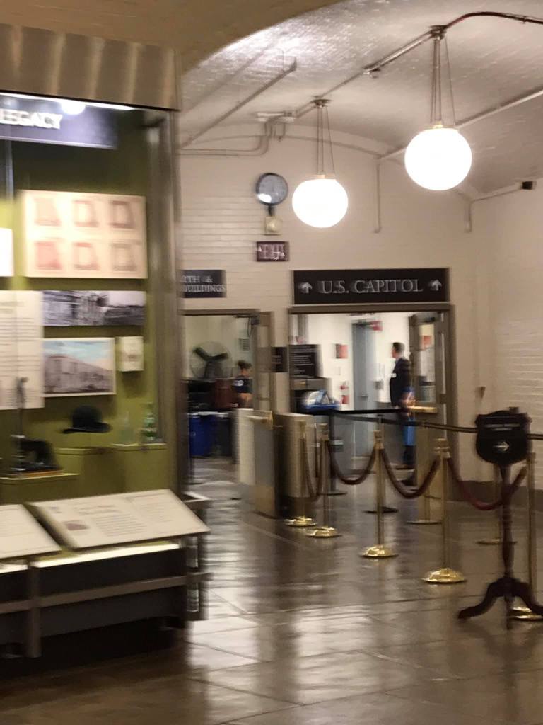 The long tunnel to the Capital Jo Paul Sherry and HenrySecurityThe tunnel lined by paintings by students from each state of the UnionContinuing the walk through the long tunnel and complexAlmost thereOur destination at the topArrival at the visitor center of the U.S. CapitalIn the visitor centerA view to the Rotunda