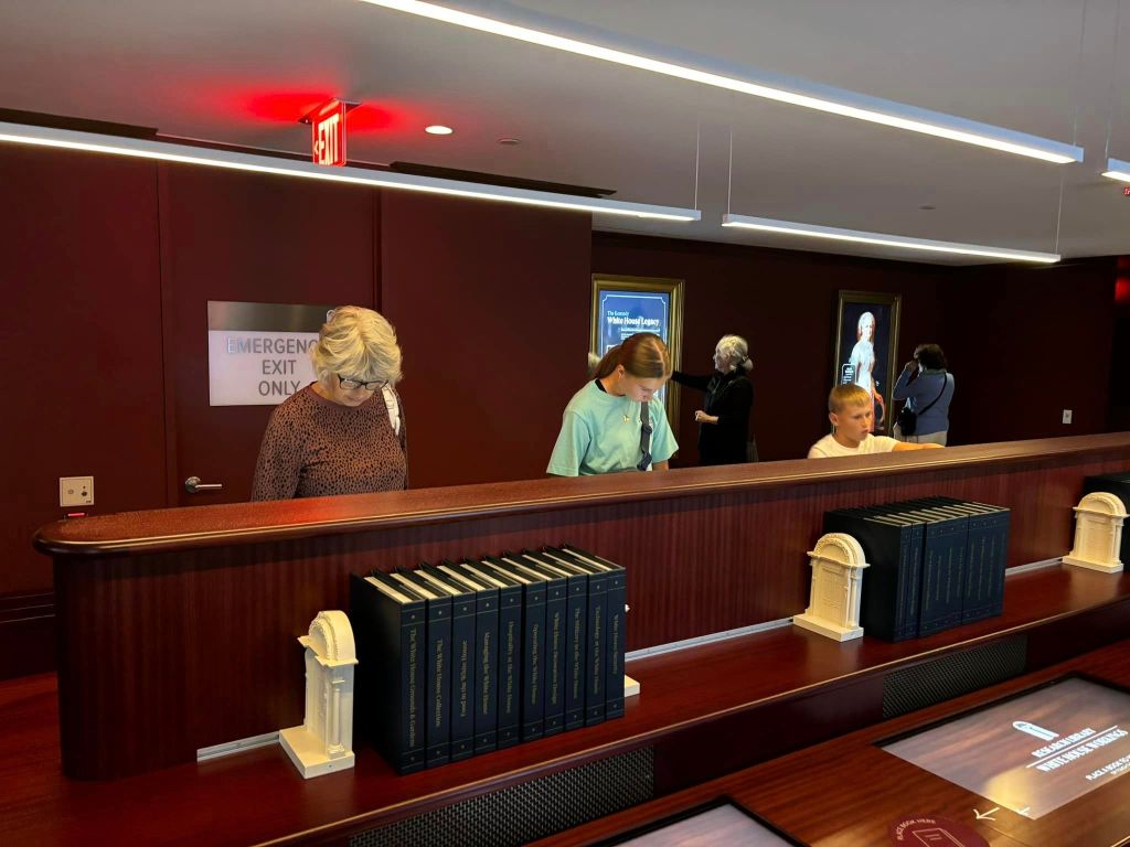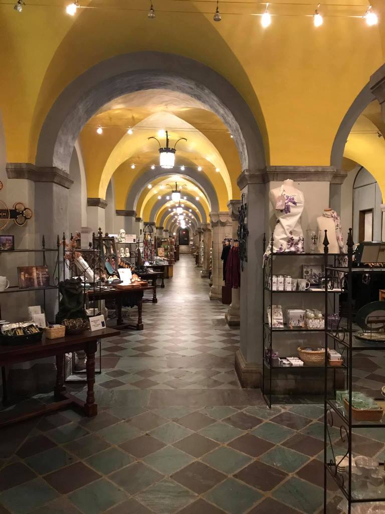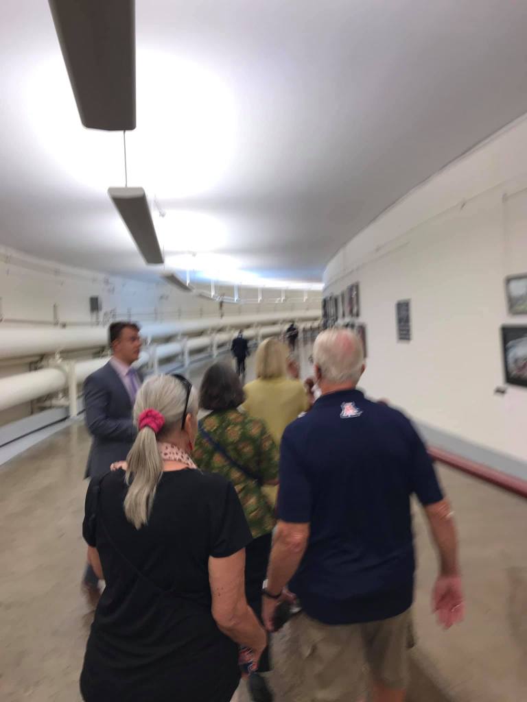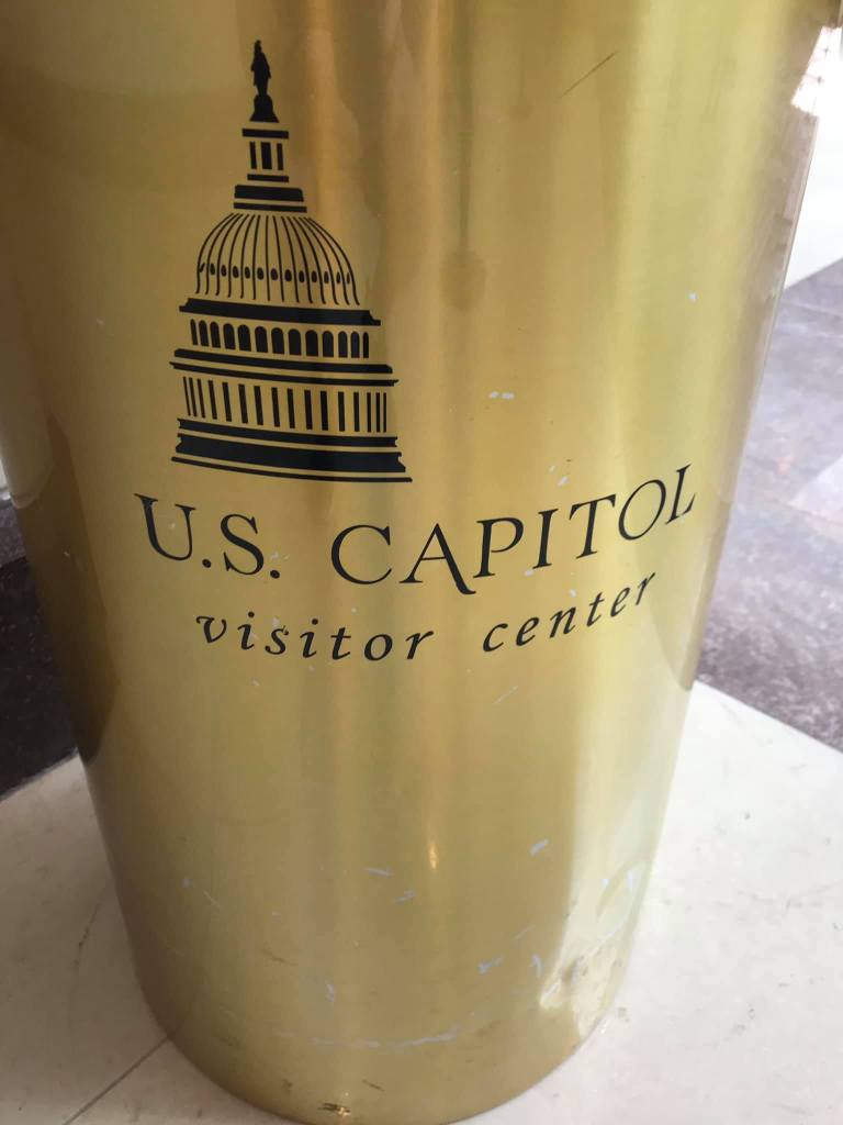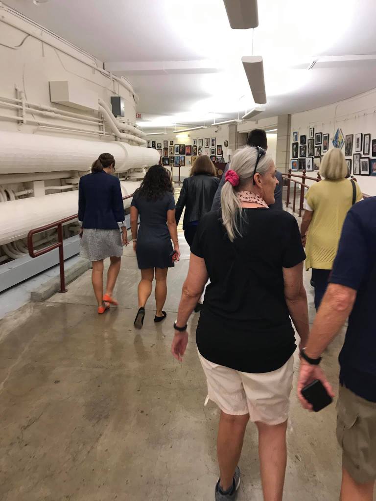 The long tunnel to the Capital Jo Paul Sherry and HenrySecurityThe tunnel lined by paintings by students from each state of the UnionContinuing the walk through the long tunnel and complexAlmost thereOur destination at the topArrival at the visitor center of the U.S. CapitalIn the visitor centerA view to the Rotunda