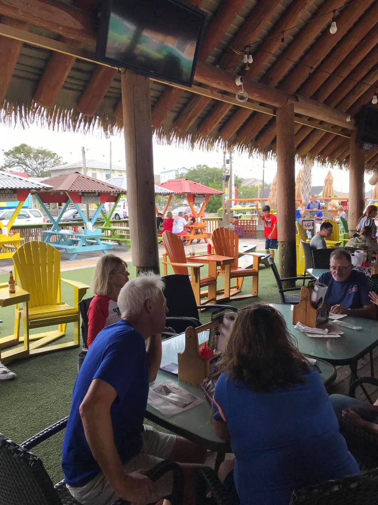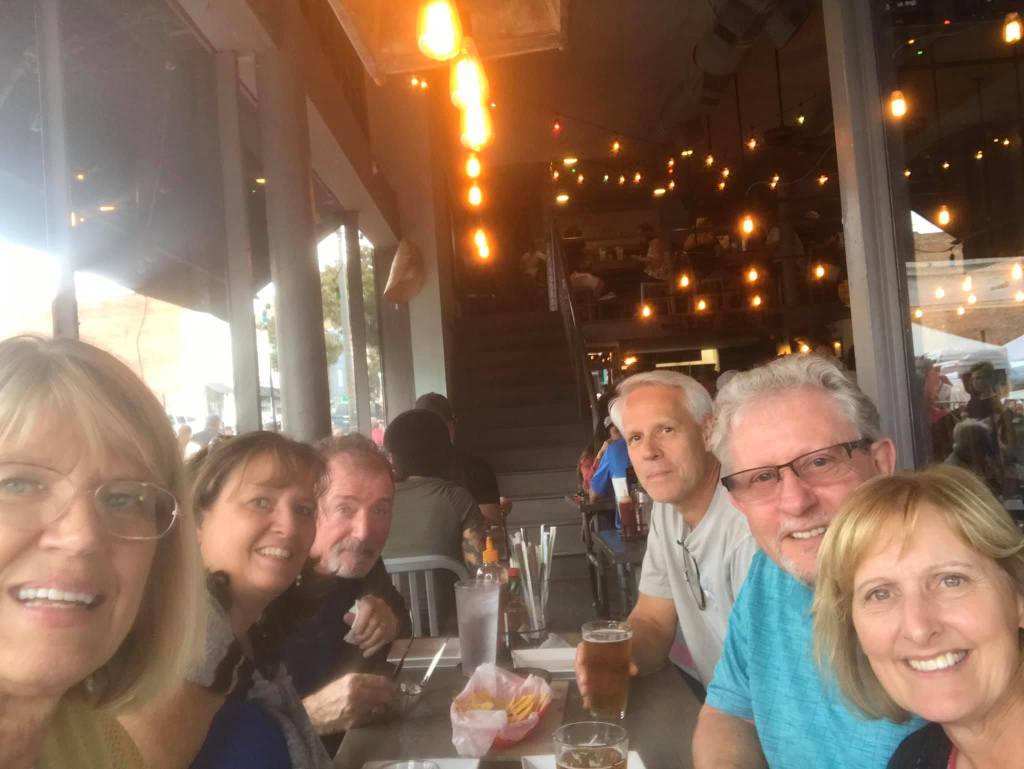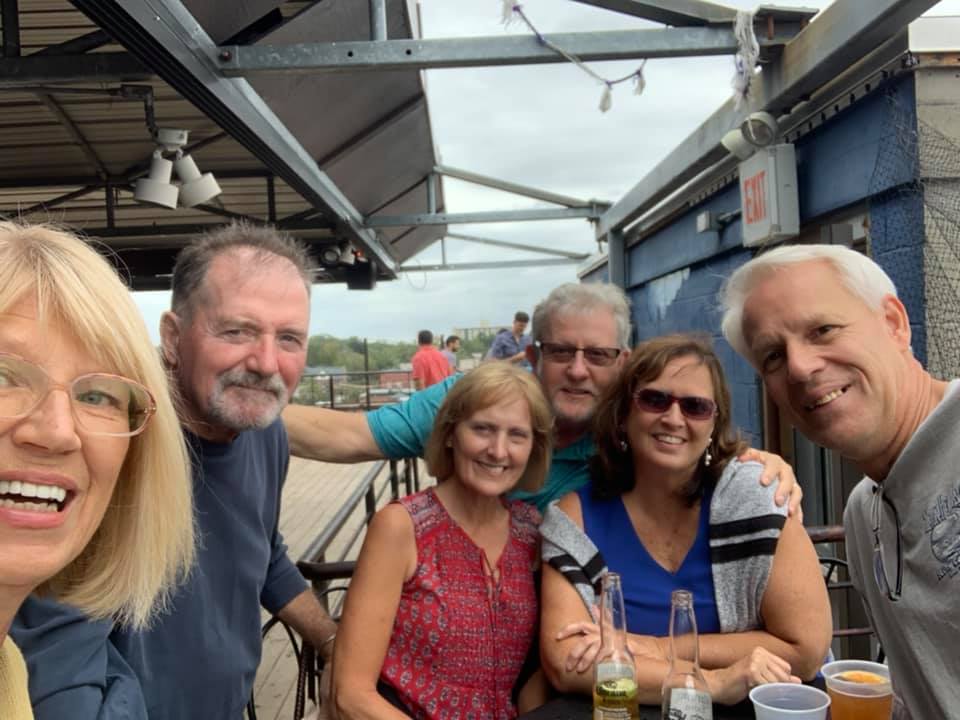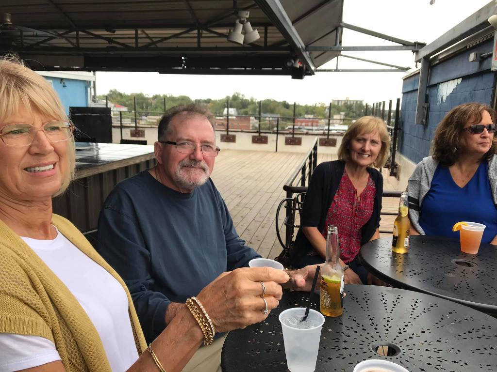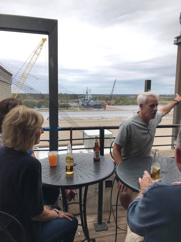 Cindy – Dottie – Jim and Buck roof top bar with the battleship North Carolina in the back ground on the Cape Fear riverSherry Buck Cindy Tom Dottie Jim then it was onto lunch before heading to the escape roomSherry Dottie Buck Jim Tom Cindy lunch