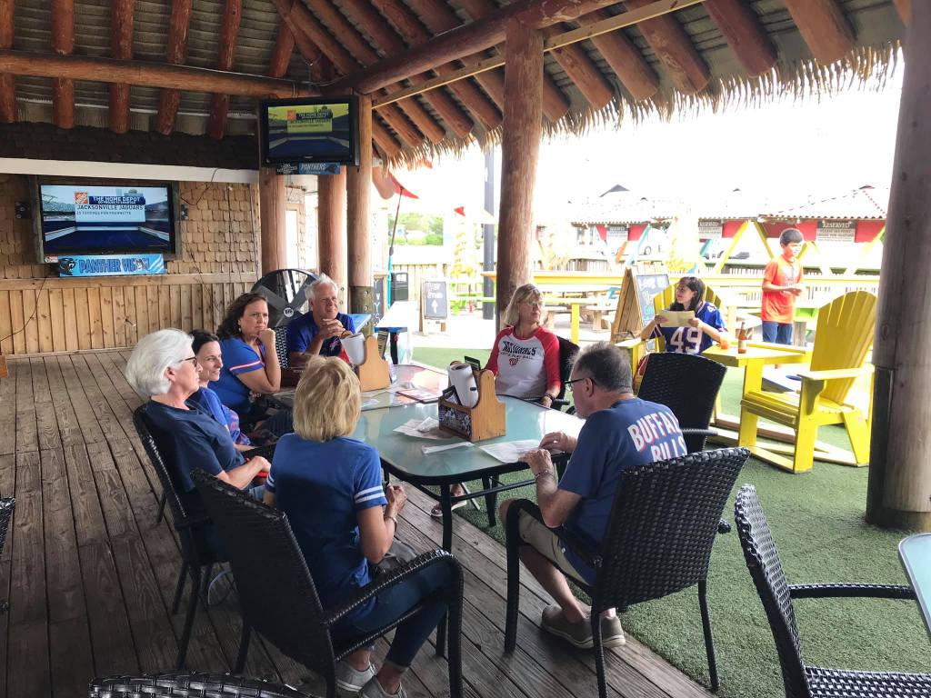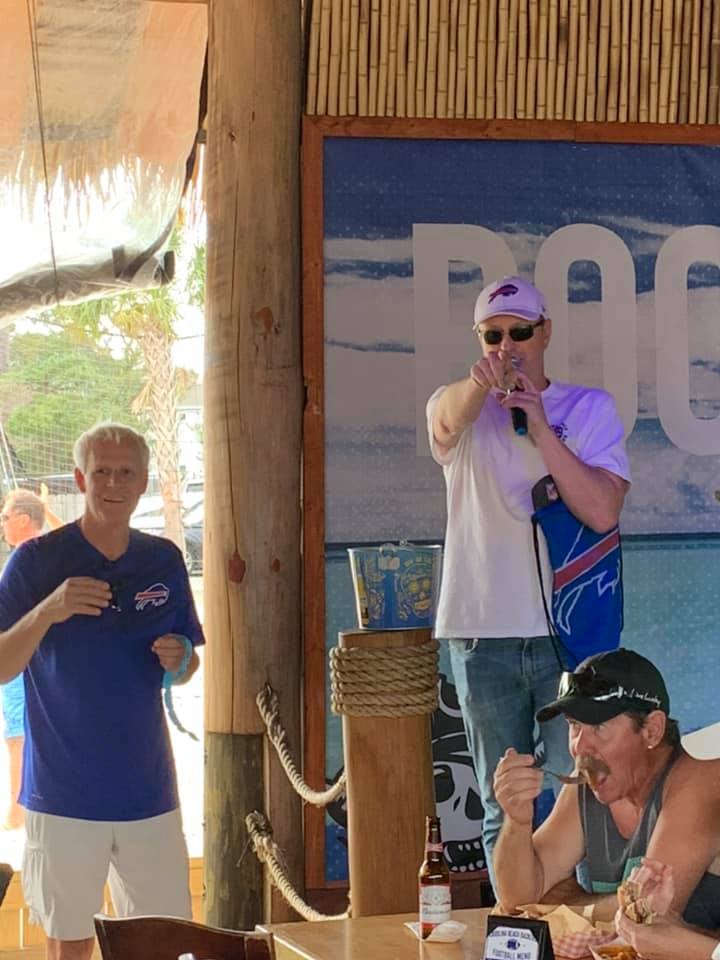 Even met Eric – who was in a band for ten years with a lady both Sherry – Jim and I worked with at the tile plant in Olean NY. Donna !As you can see – open air – covered and corn hole in the yard !Waiting for the call ! Dottie Cindy JimCindy – rabid fan !Bills score !